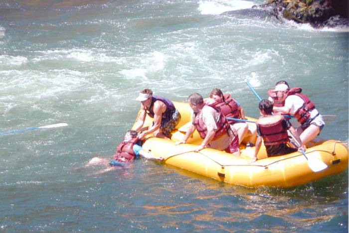 Rescuer pulling Donna back into the raft as her oar goes floating